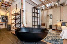 Deze ruimte (tevens toegankelijk vanaf de straat met twee openslaande, getoogde deuren) is geschikt voor het stallen van een voertuig. Aan de achterzijde een zeer ruime slaapkamer met open badkamer met een ligbad, douche, vaste wastafel en opstelplaats voor wasmachine en -droger. Vanuit de slaapkamer een fraaie gietijzeren wenteltrap naar eerste verdieping.