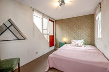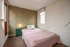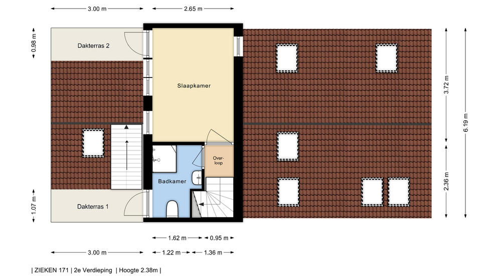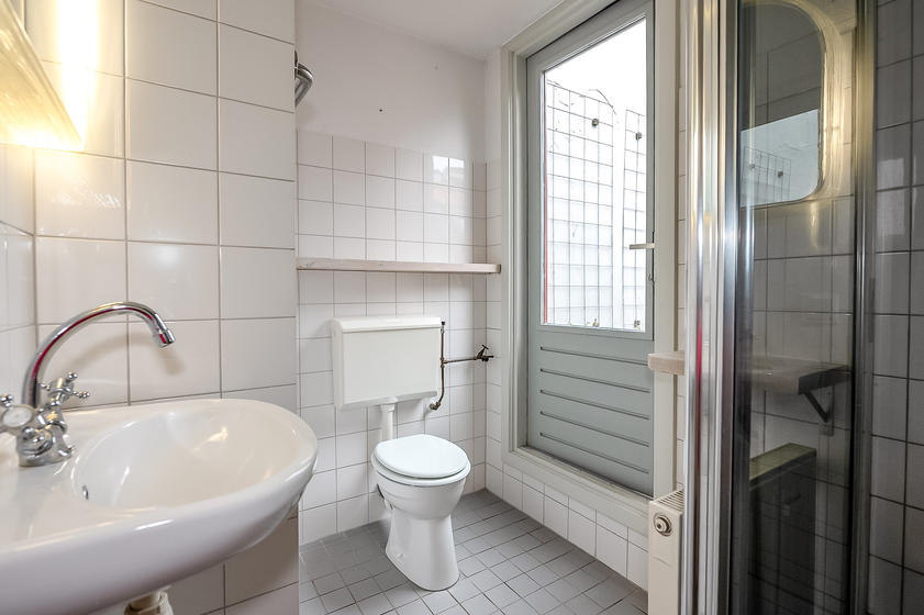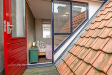 Overloop. Slaapkamer met een deur naar een beknopt dakterras en badkamer 2 met douche, vaste wastafel, wc en deur naar een klein dakterras.