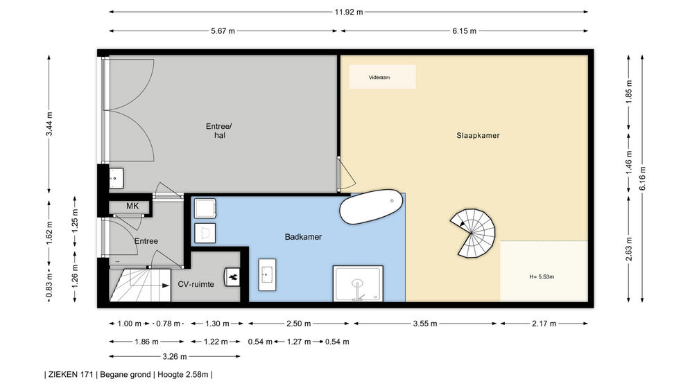 Entree, vestibule met meterkast, stookruimte met Cv-ketel en een binnentrap naar eerste verdieping. Vanuit de vestibule tevens een deur naar een ruime werkruimte/garage/entreehal.